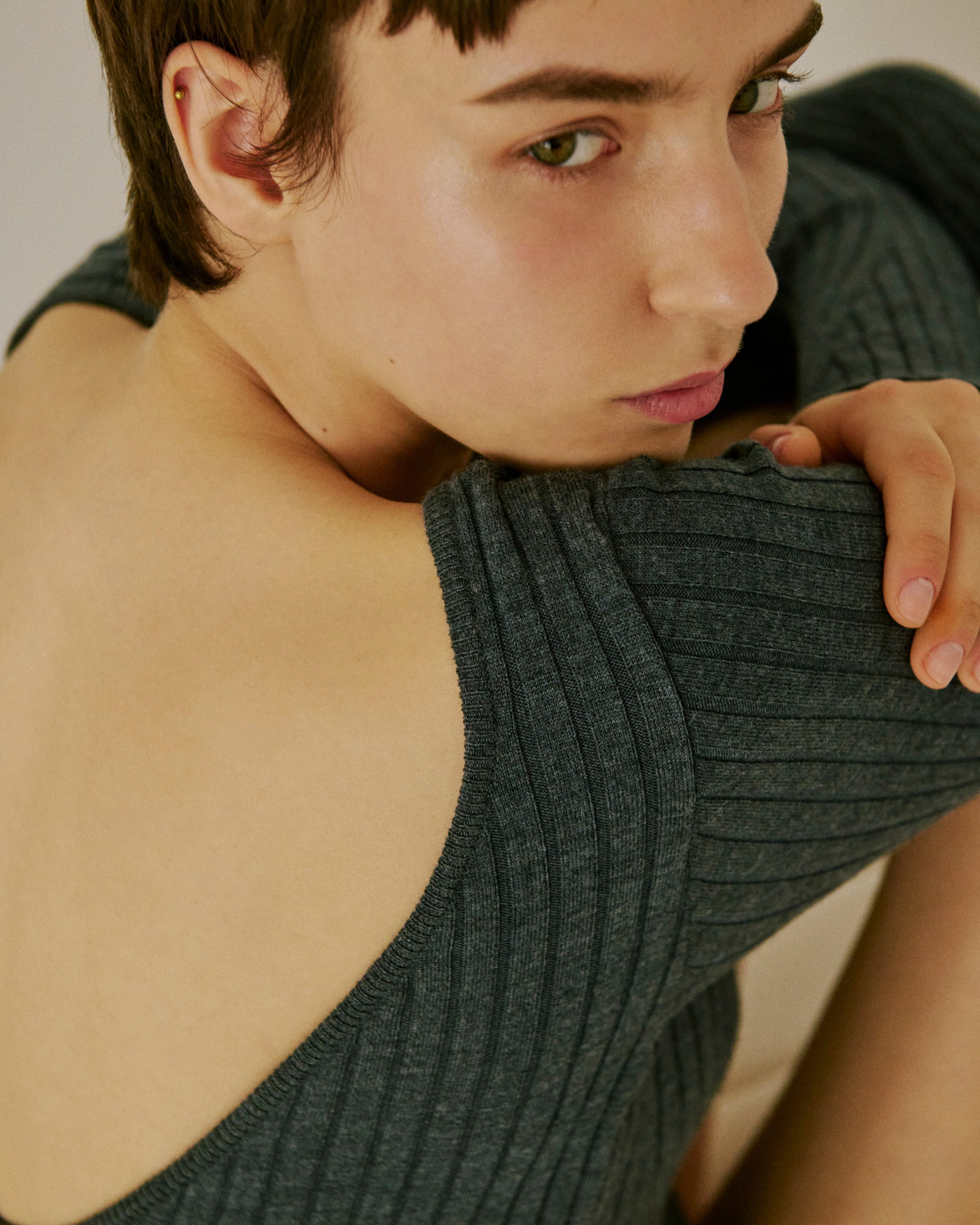 それらを叶えるために、ニットならではのしなやかな曲線や、ストレッチ糸の複雑な組み合わせで生まれるフィット感を精密にデザインし、シンプルでありながらも洗練された美しさを生み出しています。