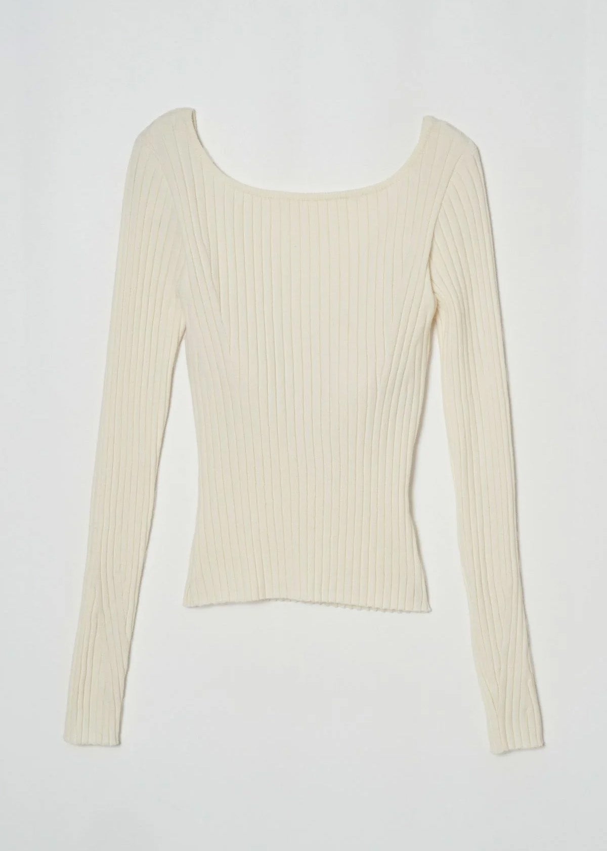 バックスタイルで魅せるミニマルなデザインのウールリブニットシェル。