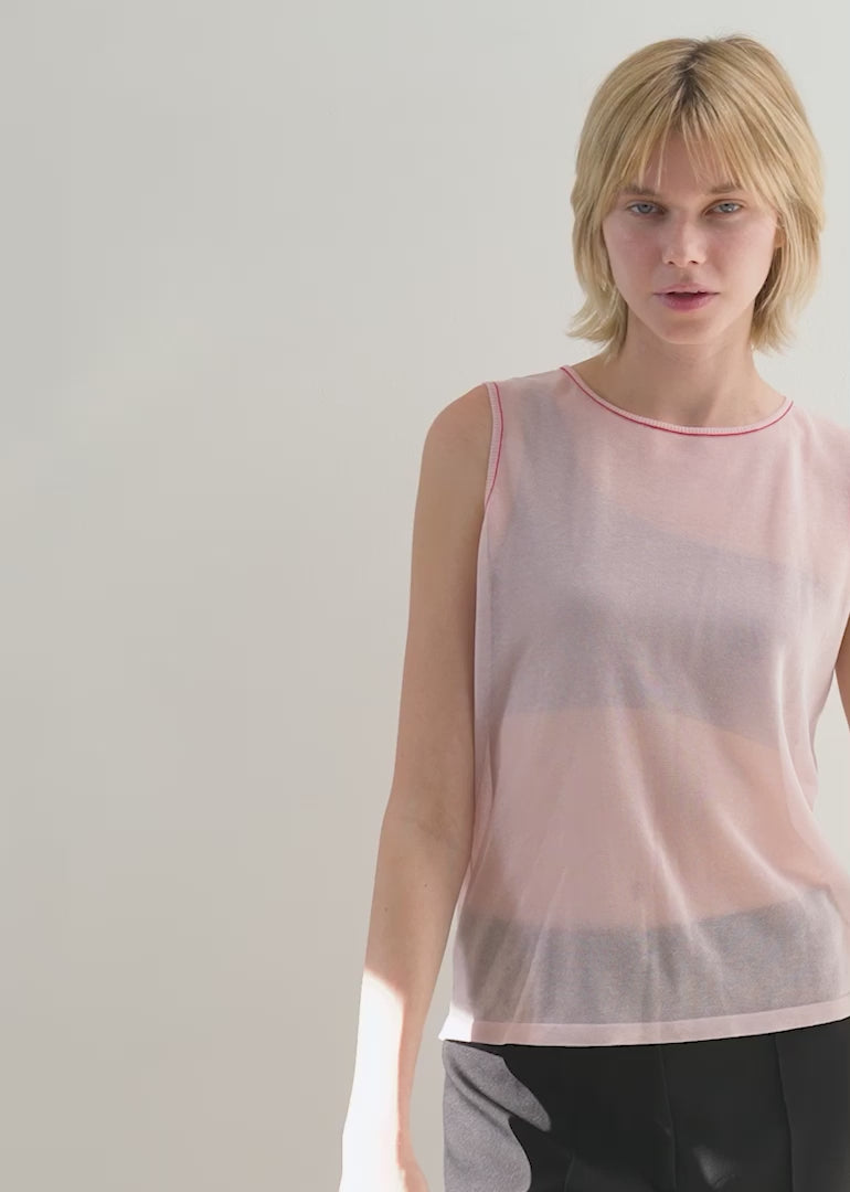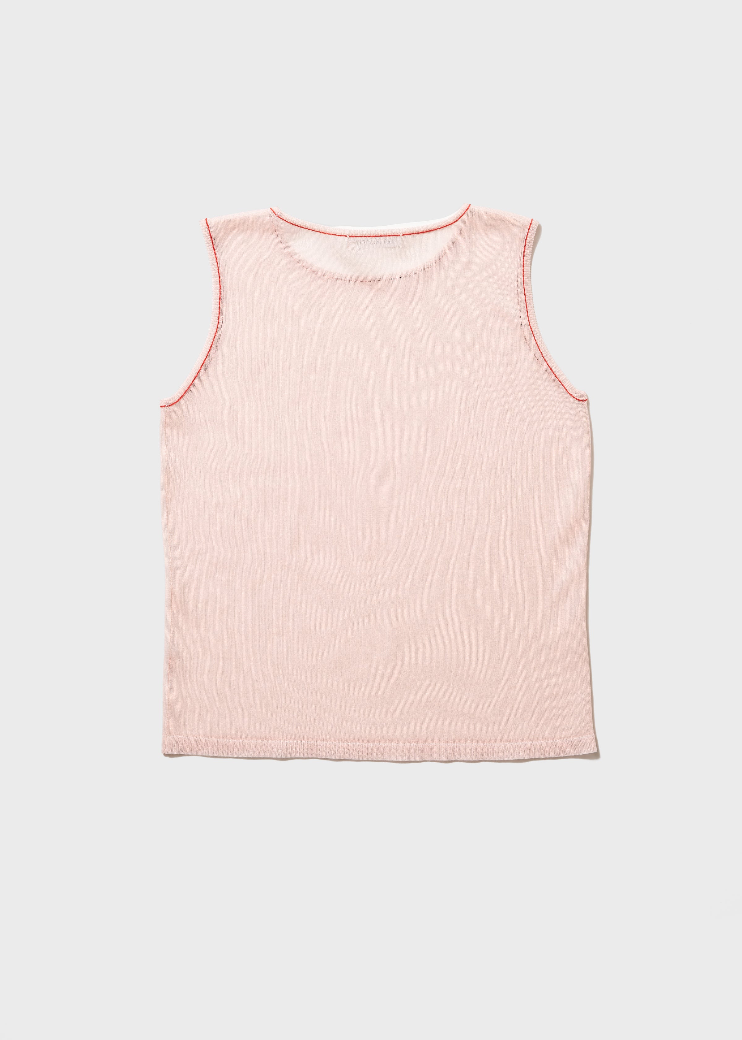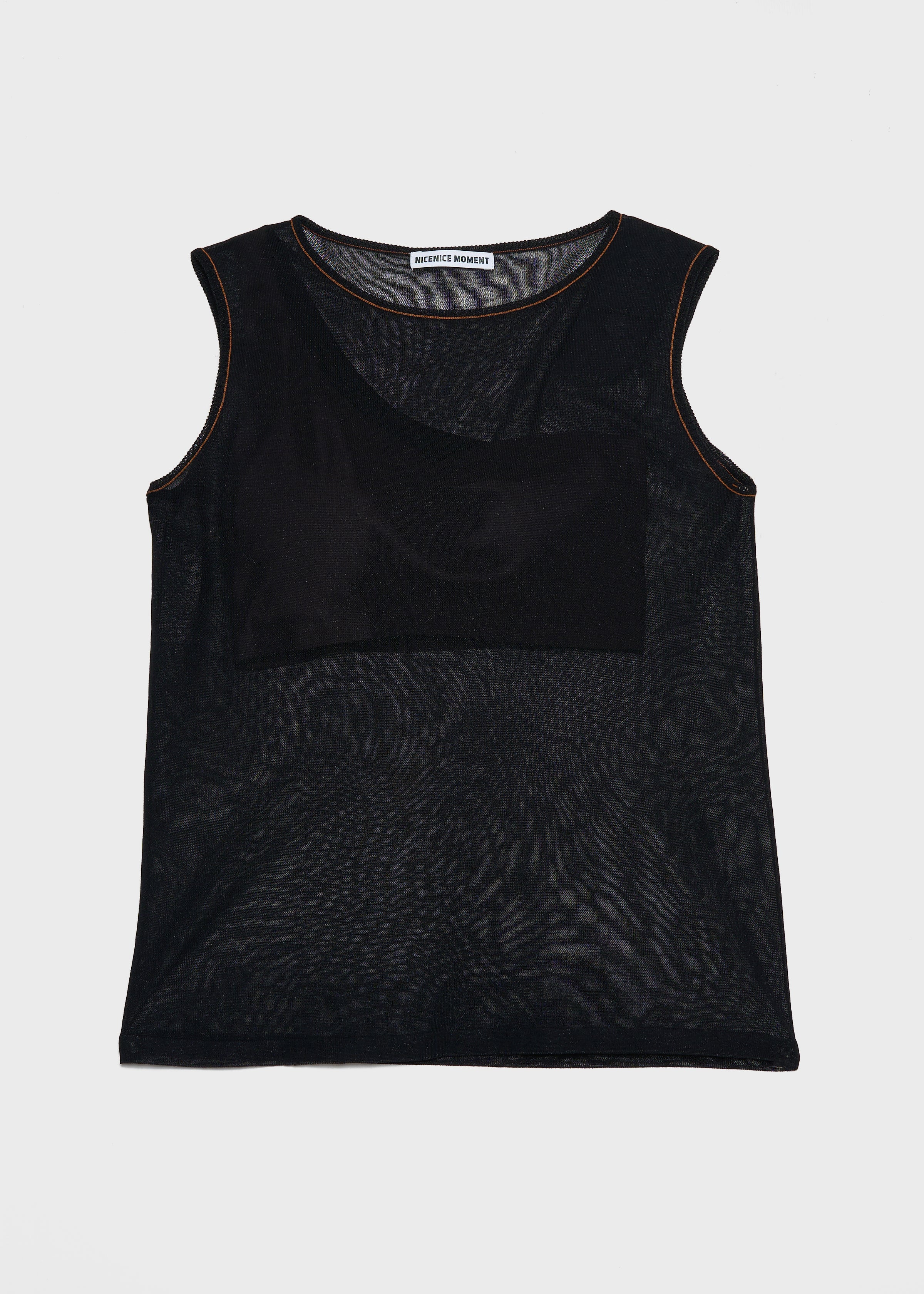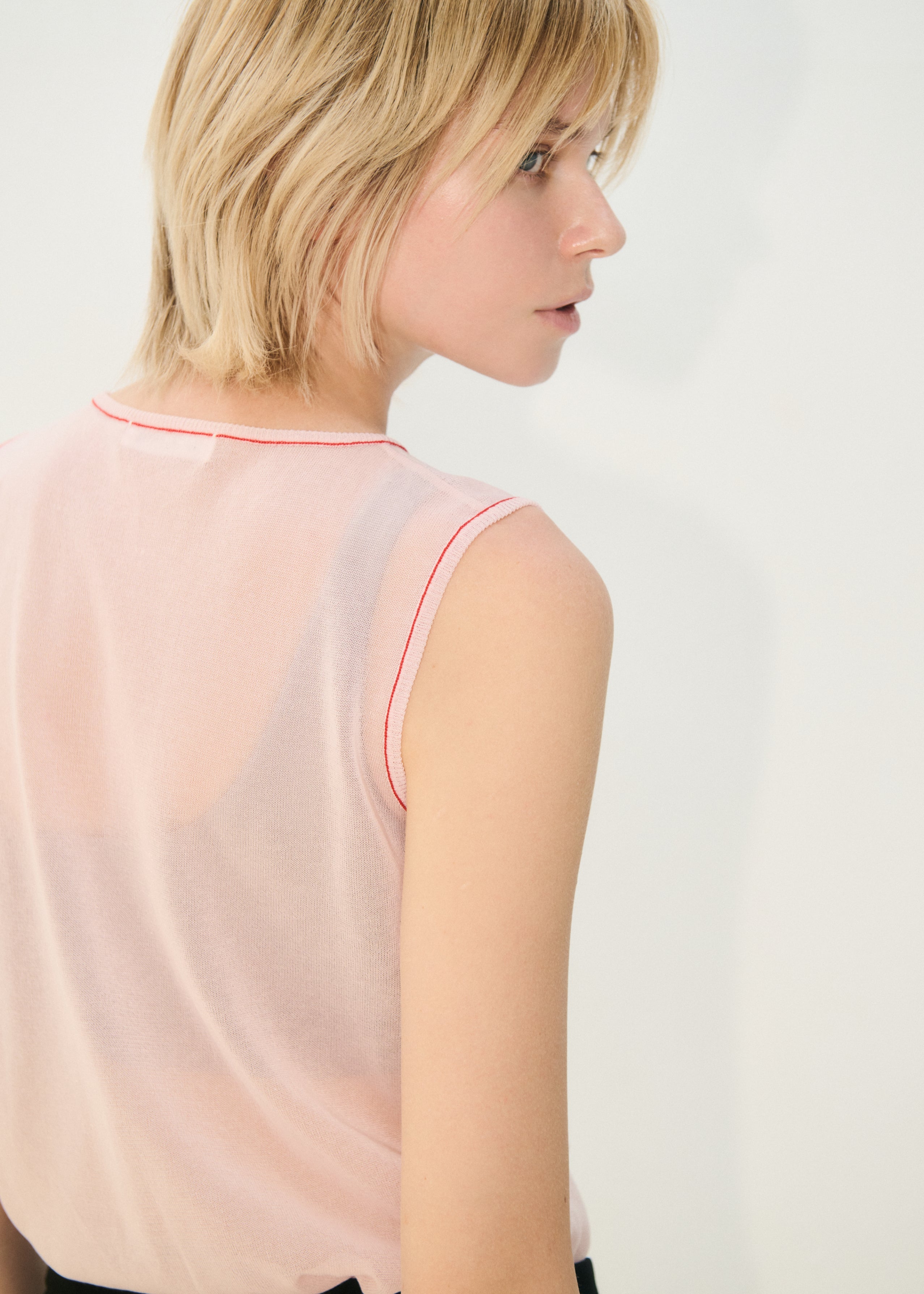 透け感のあるシアーニットとワンショルダーのインナーブラセット。ニットシェルはコットンシルクの繊細な糸に透明なナイロン糸をプレーティングし、ハリ感を出した肌離れの良い質感です。