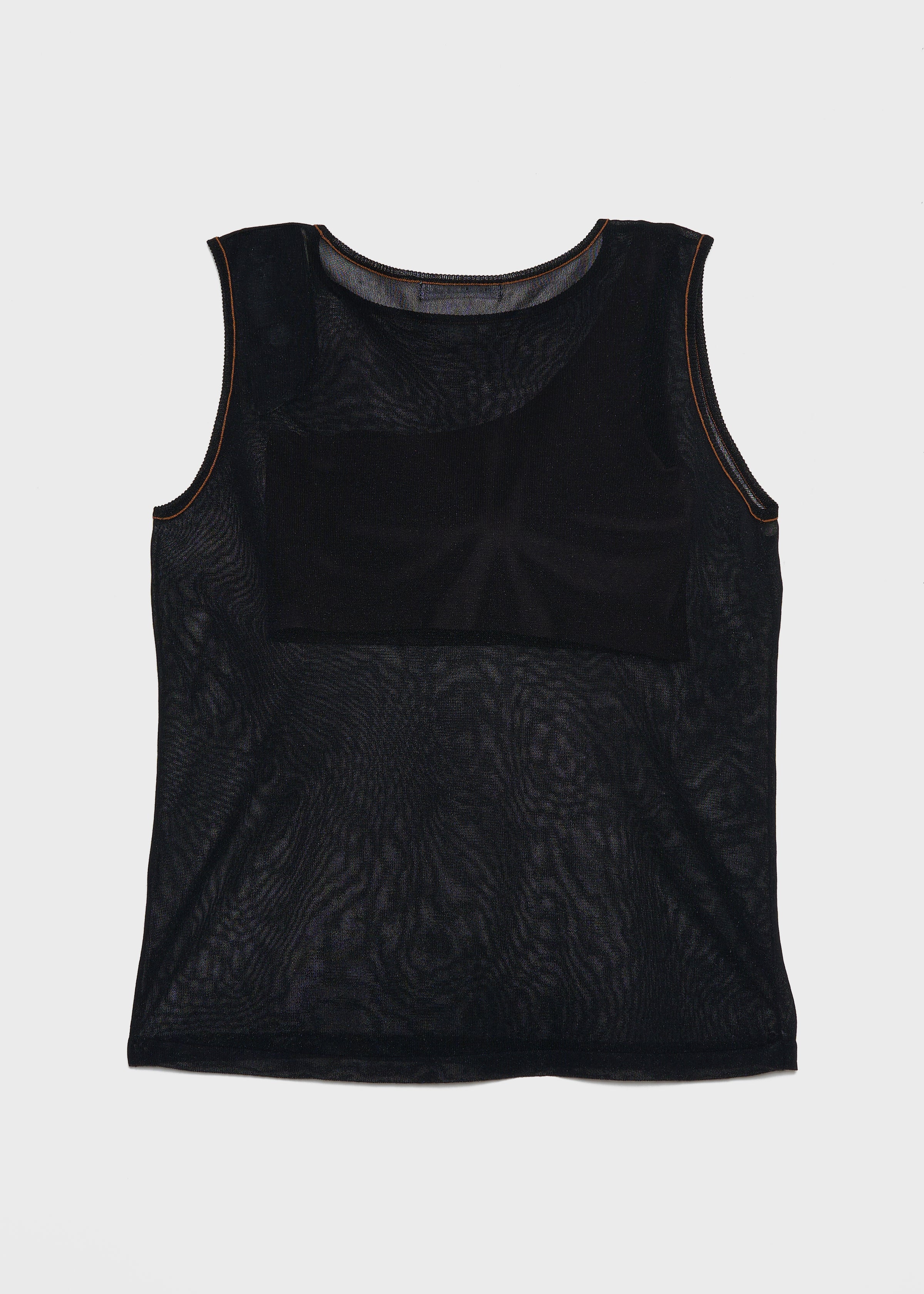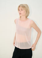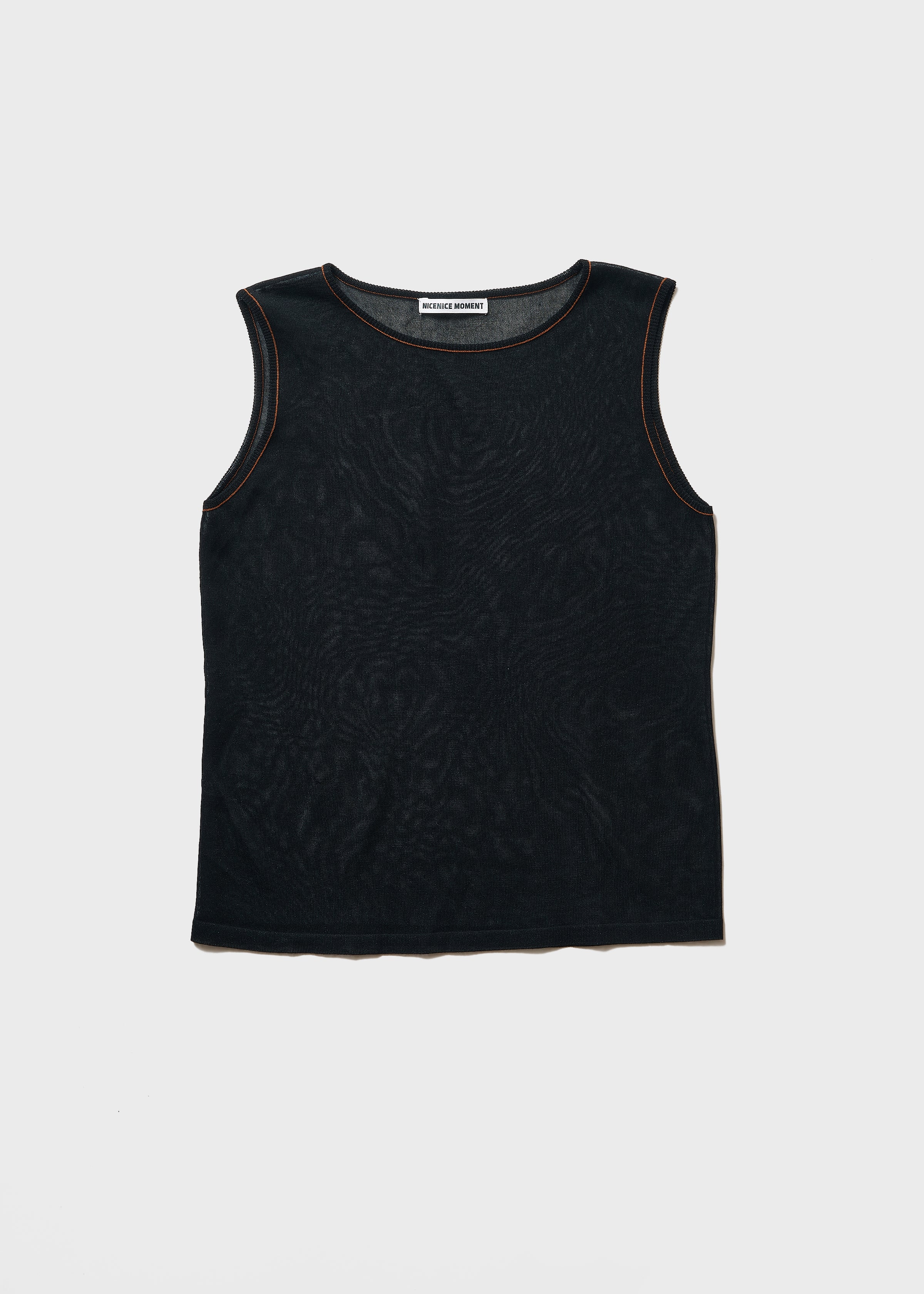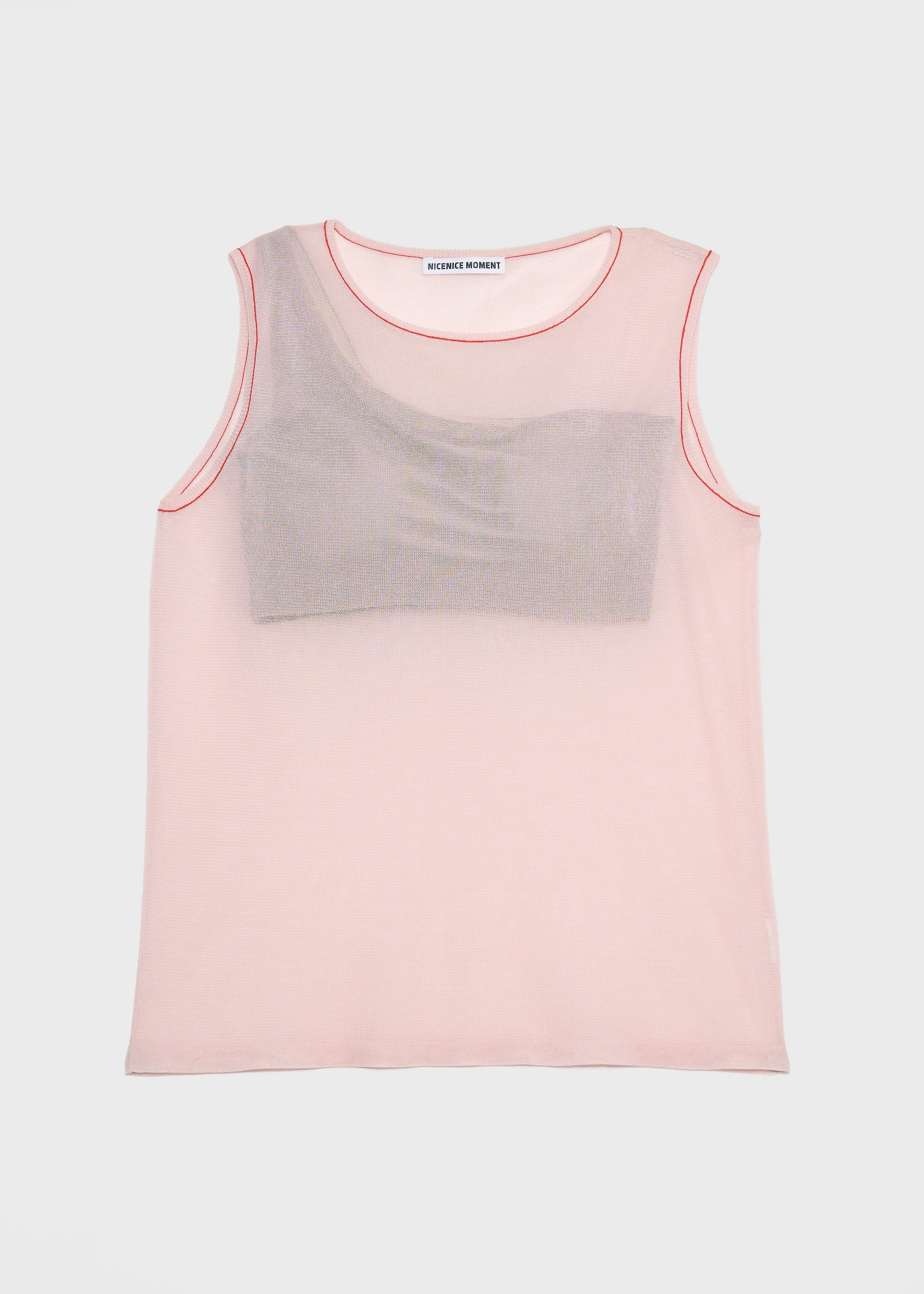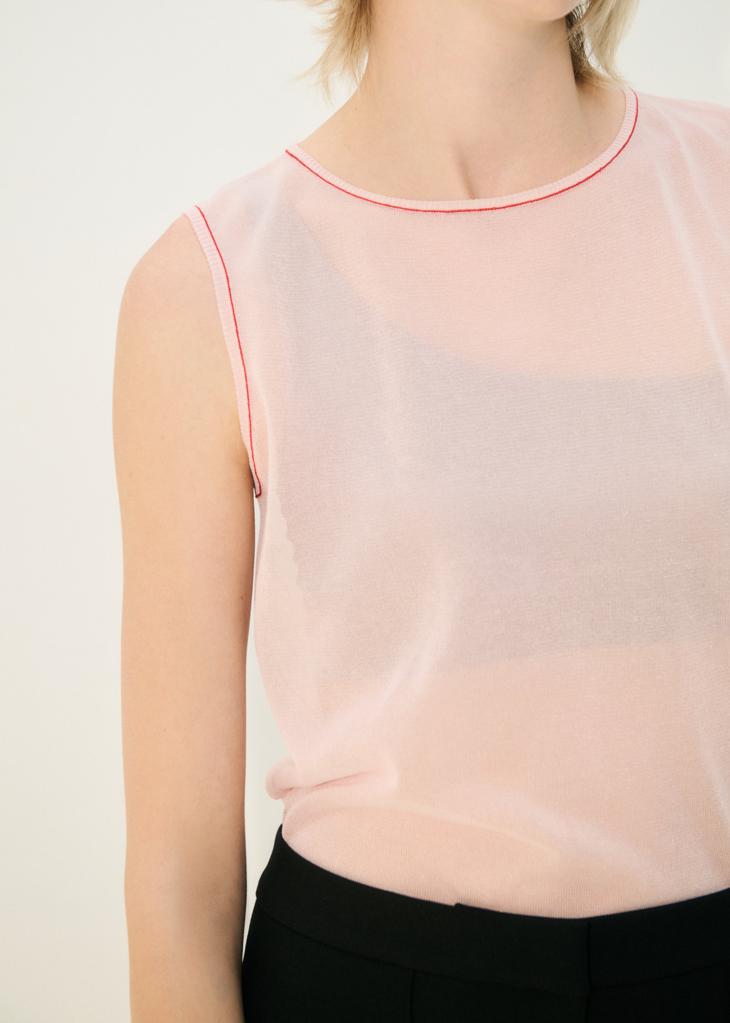 透け感のあるシアーニットとワンショルダーのインナーブラセット。ニットシェルはコットンシルクの繊細な糸に透明なナイロン糸をプレーティングし、ハリ感を出した肌離れの良い質感です。