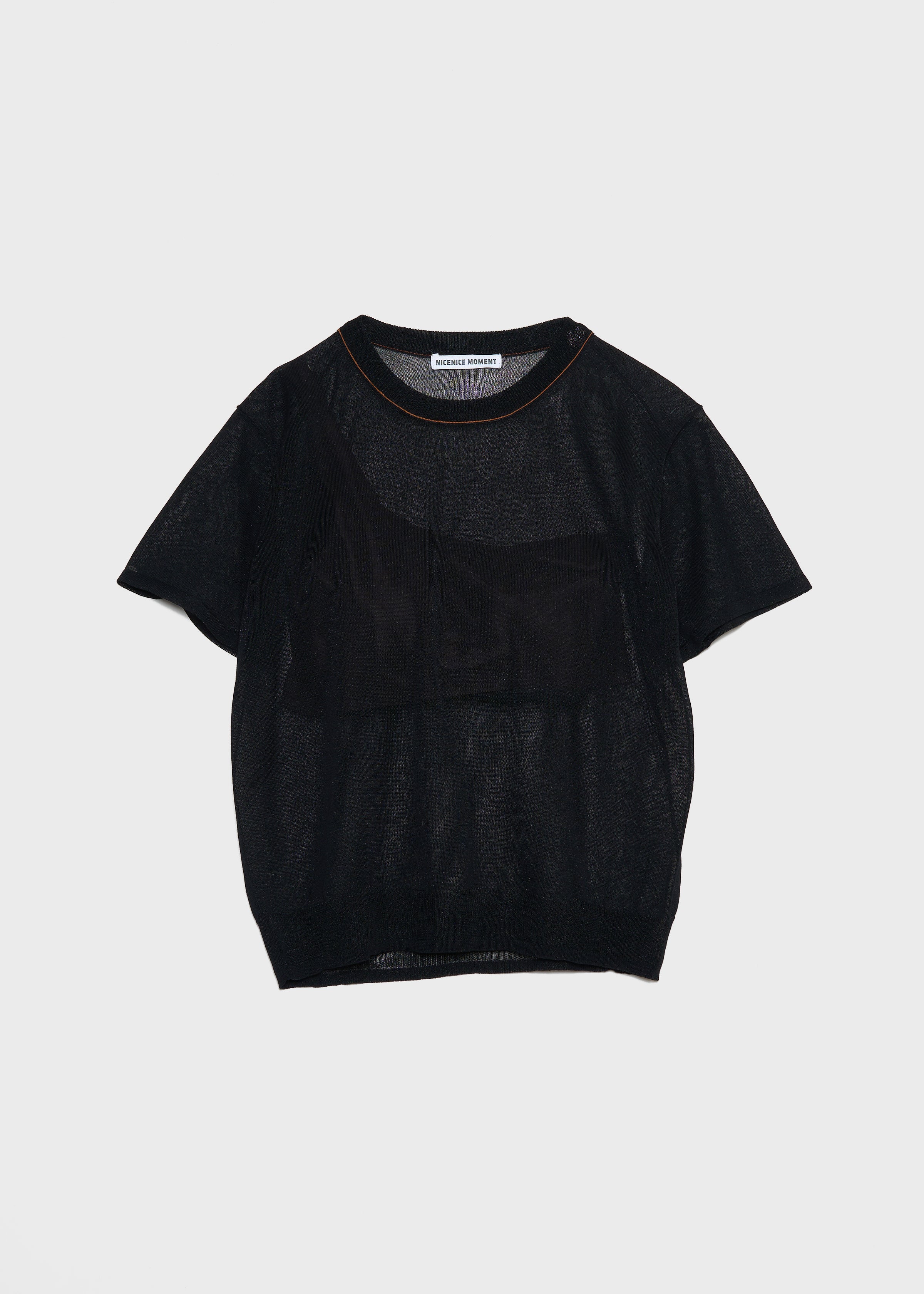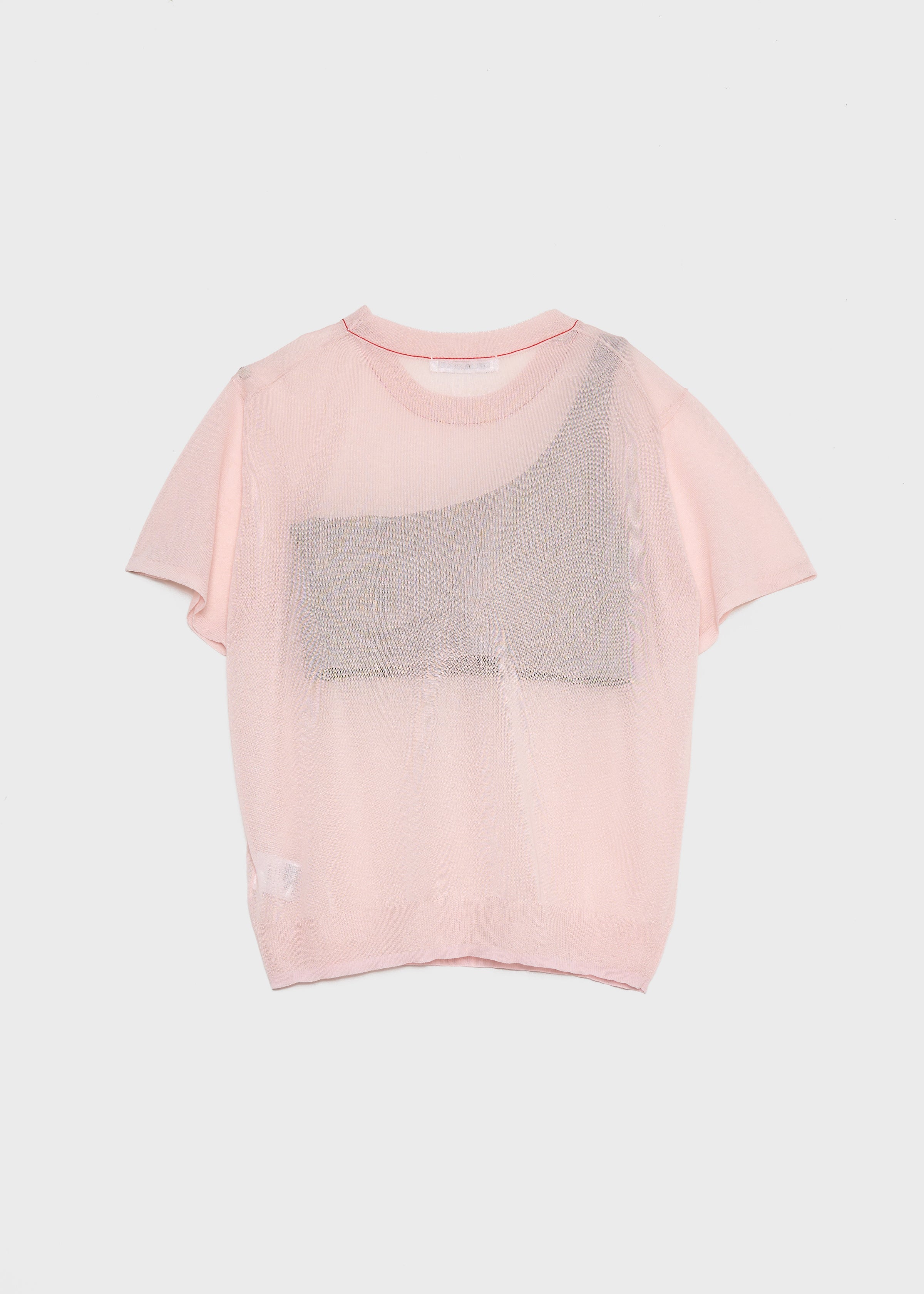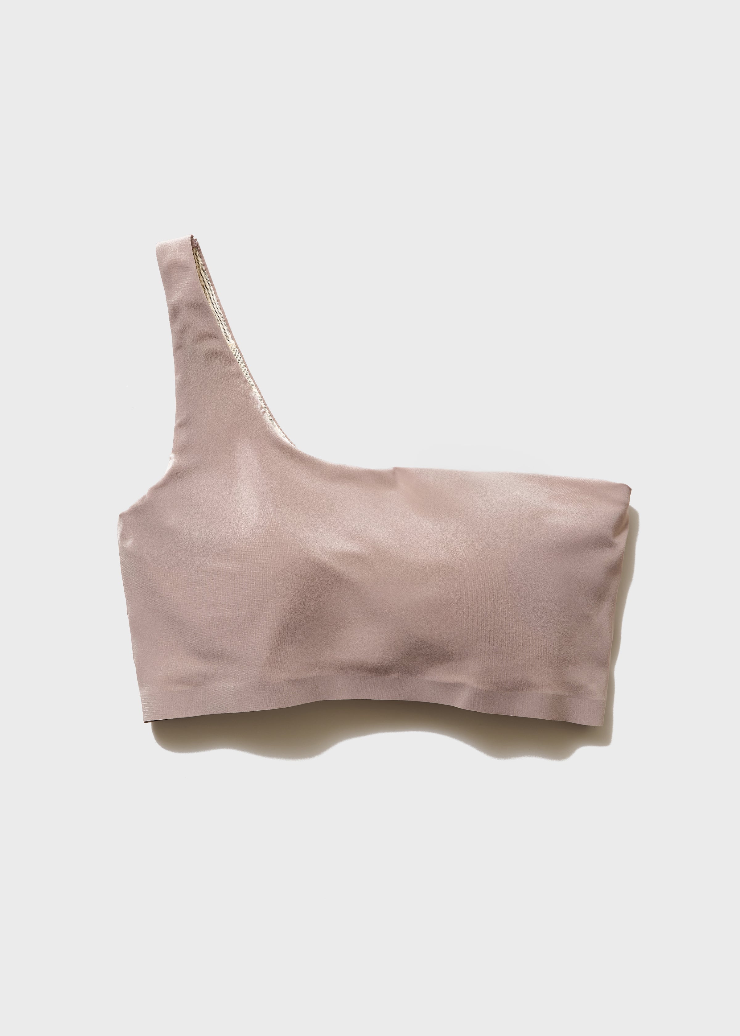 透け感のあるシアーニットとワンショルダーのインナーブラセット。ニットシェルはコットンシルクの繊細な糸に透明なナイロン糸をプレーティングし、ハリ感を出した肌離れの良い質感です。