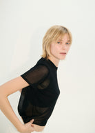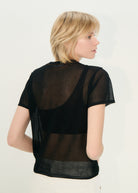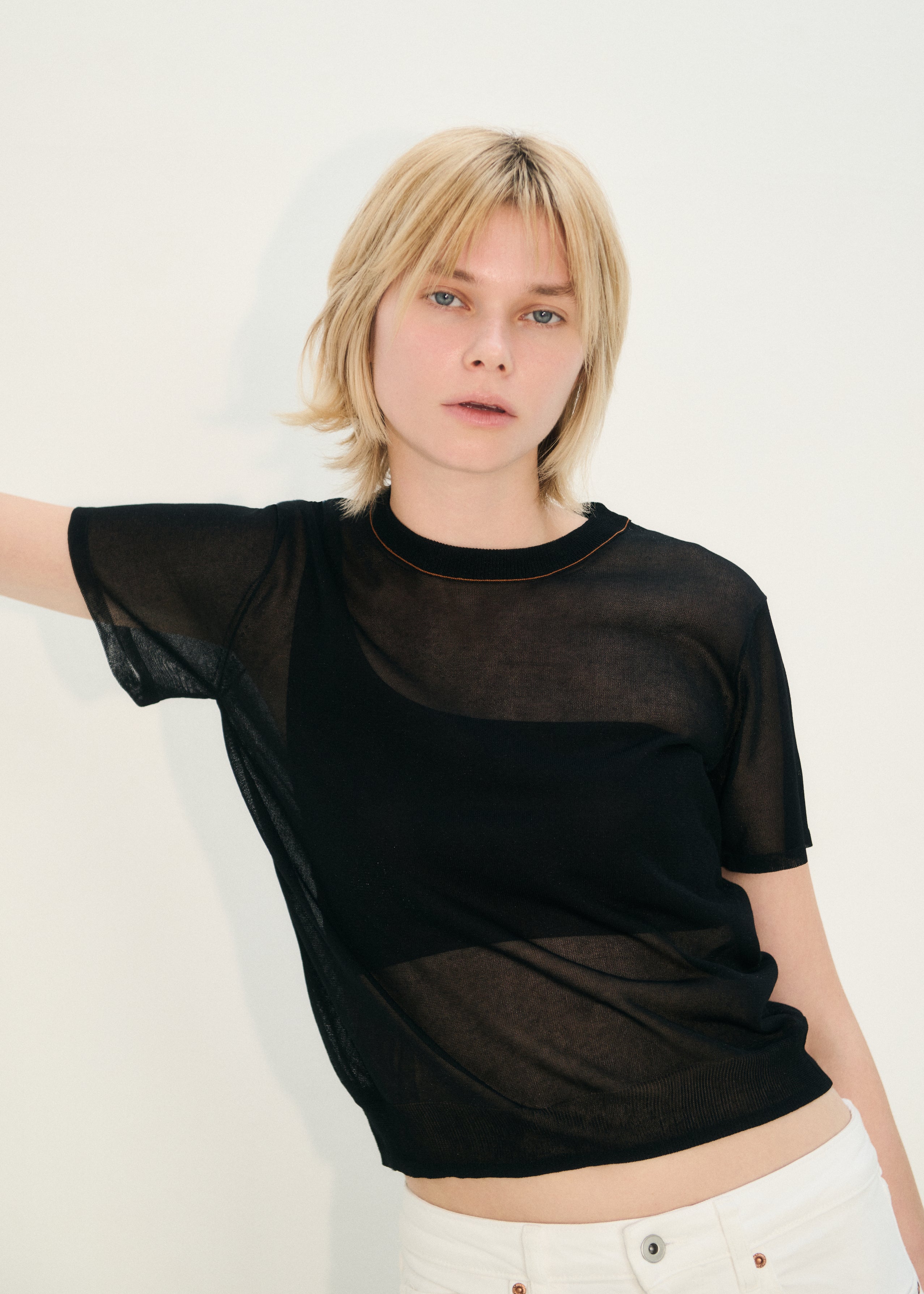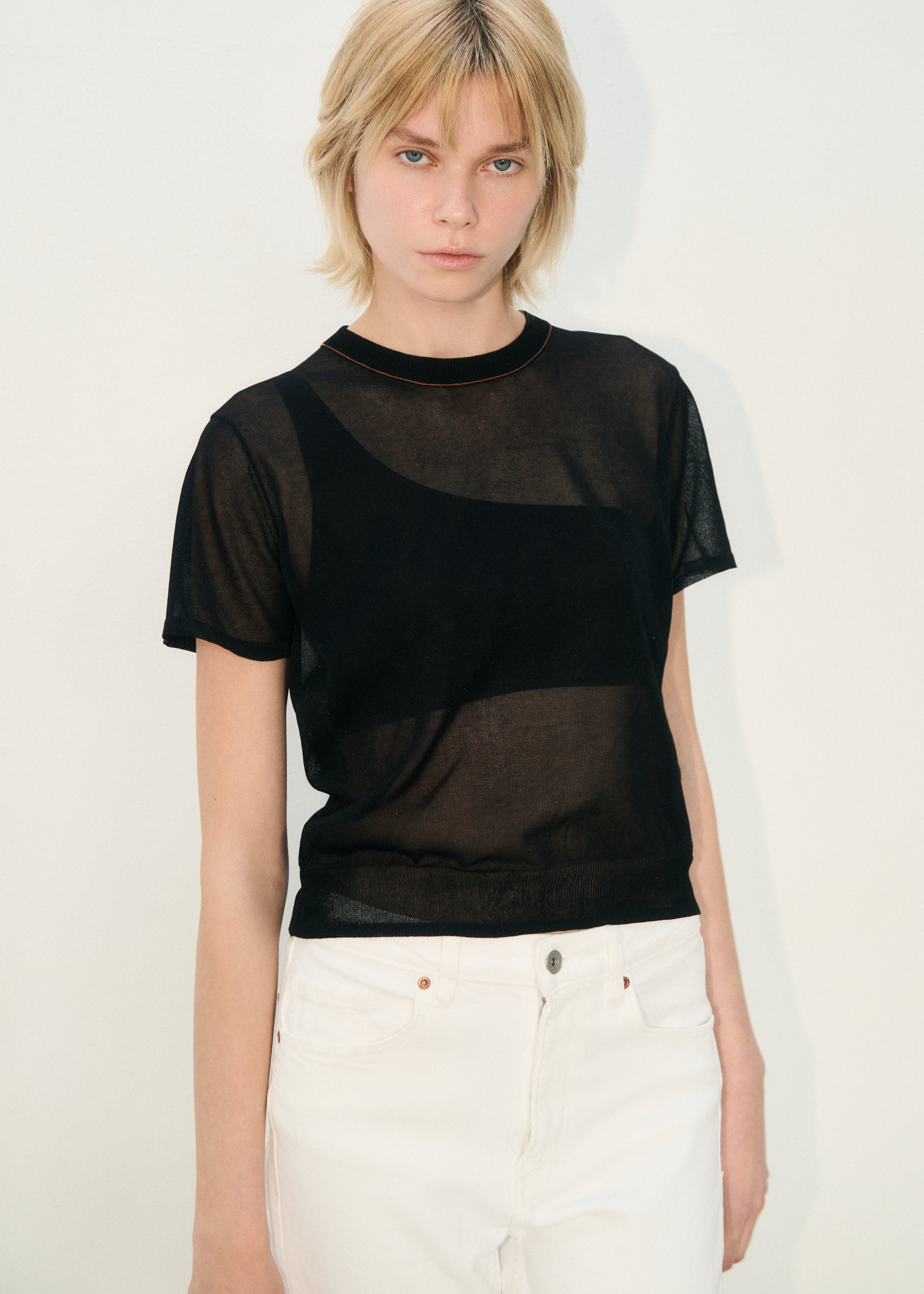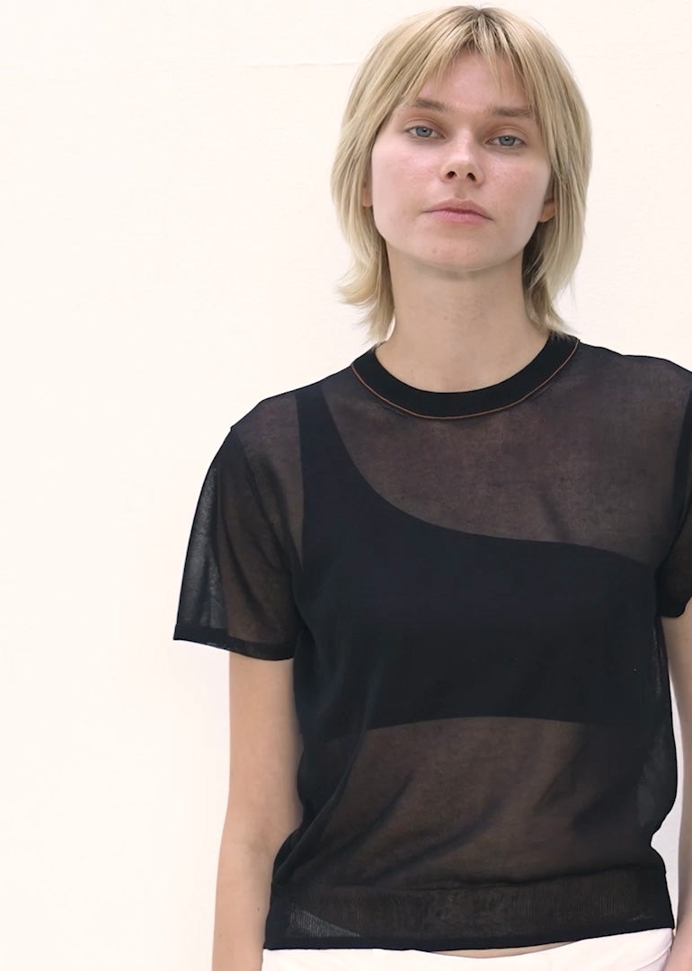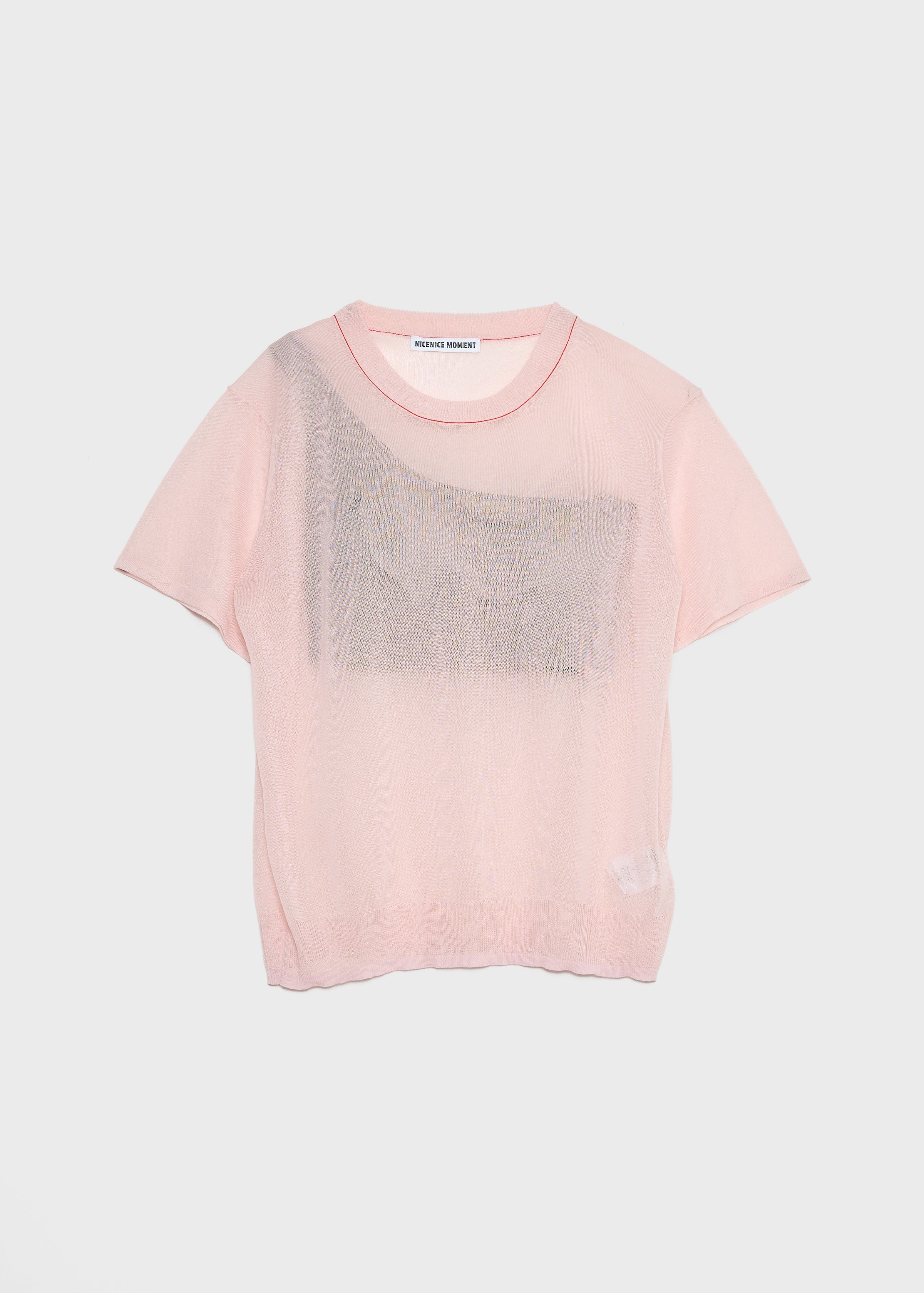 透け感のあるシアーニットとワンショルダーのインナーブラセット。ニットシェルはコットンシルクの繊細な糸に透明なナイロン糸をプレーティングし、ハリ感を出した肌離れの良い質感です。